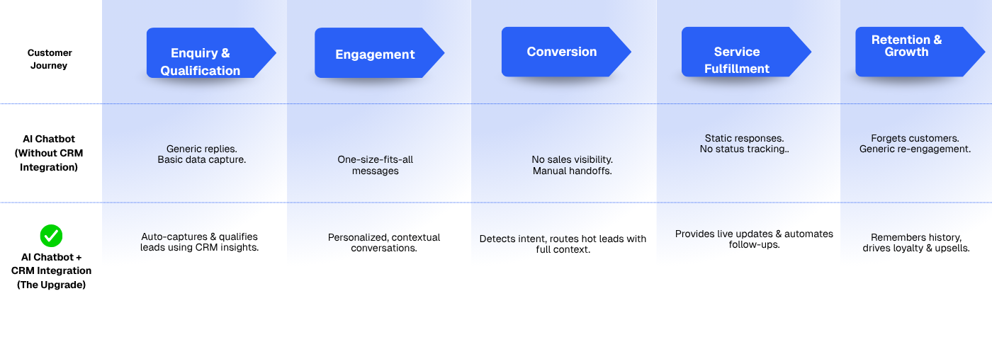 The real power of AI Chatbots unfolds when they operate in sync with CRM systems. Together, they bridge the gap between automation and intelligence.