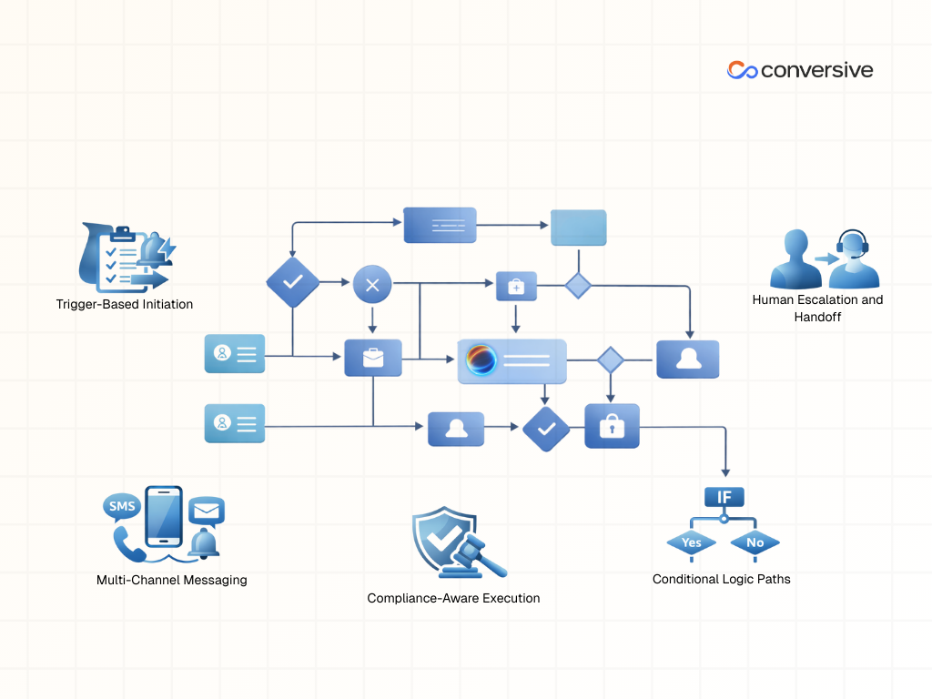 This is the execution layer, like sending an SMS, making a voice call, collecting an e-signature, or handing the conversation off to a human agent.
