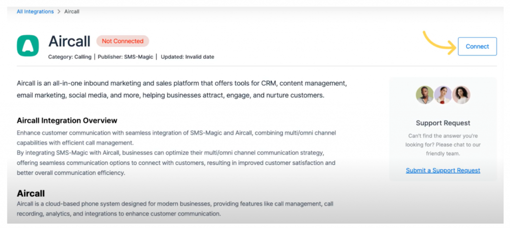 From your SMS Magic dashboard, navigate to the Aircall Integration Settings. Use OAuth authentication or enter your Aircall API key to authorize the connection. This syncs both platforms, enabling linked contact data and unified activity tracking across voice and messaging.