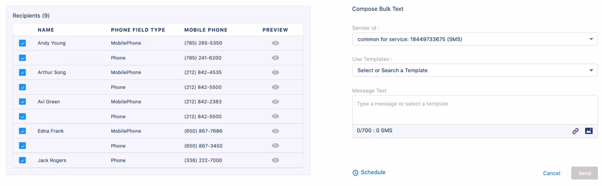 For teams that work primarily within Salesforce, Conversive enables bulk SMS campaigns without ever leaving the CRM. This approach ensures your messaging is fully integrated into lead, contact, or campaign workflows with consent, history, and status updates logged automatically at the record level.